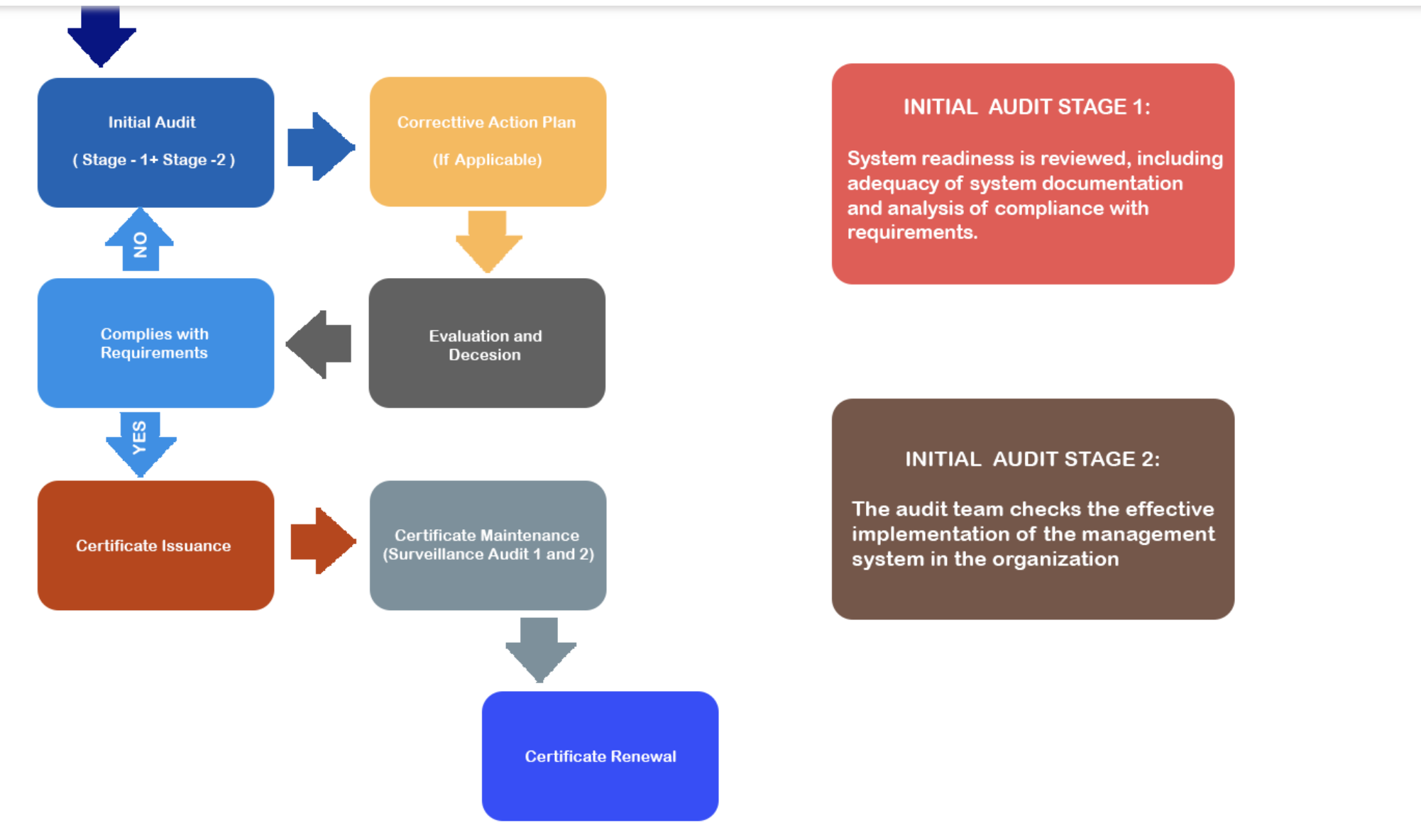 An ISO certification is valid for three years; however, ISO requires that surveillance audits be performed each year to ensure that the management system continues to operate effectively. This means that every 12 months during the 3-year cycle, an organizationโ€™s management system (MS) must undergo an external audit, where an auditor will assess portions of MS.